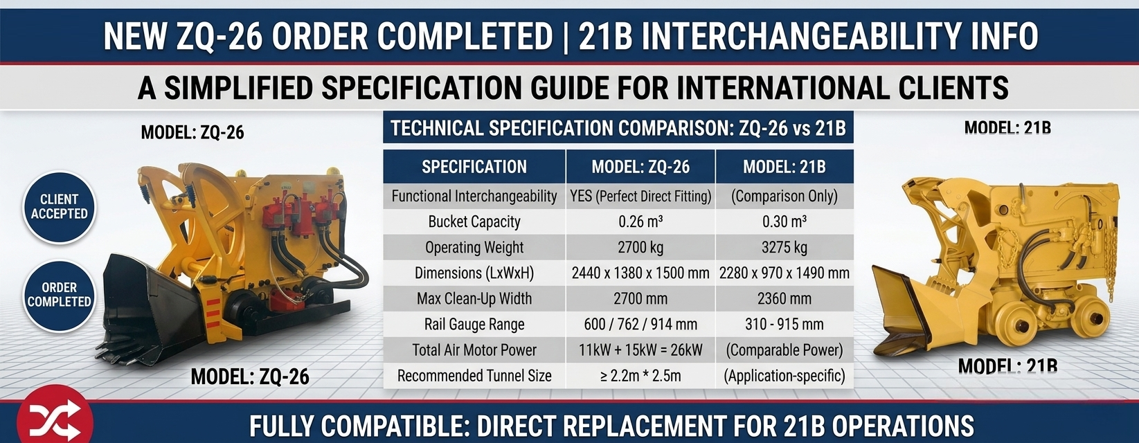 La pala neumática de rocas ZQ-26 ofrece una capacidad de producción de 50 a 60 m³/h y opera de forma segura en pendientes inferiores a 8 grados. Es compatible con anchos de vía de 457 mm, 500 mm y 600 mm, y funciona de manera óptima en túneles con dimensiones mínimas de 1,8 m × 2,25 m.