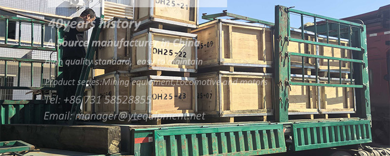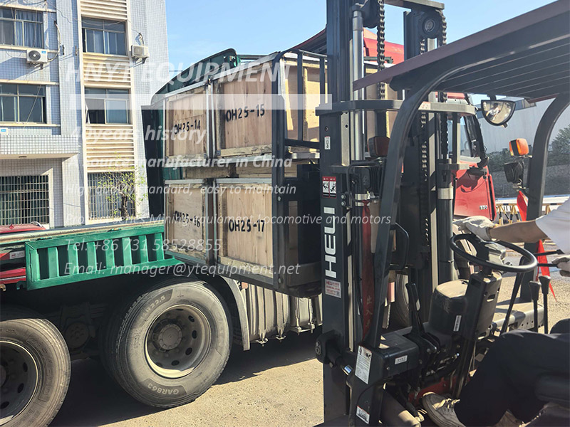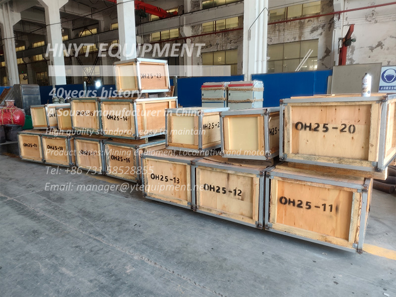Se ha enviado al extranjero un lote de motores de tracción para locomotoras mineras. Cada motor se embala cuidadosamente con protección impermeable y antipolvo, y se almacena en cajas de madera individuales.